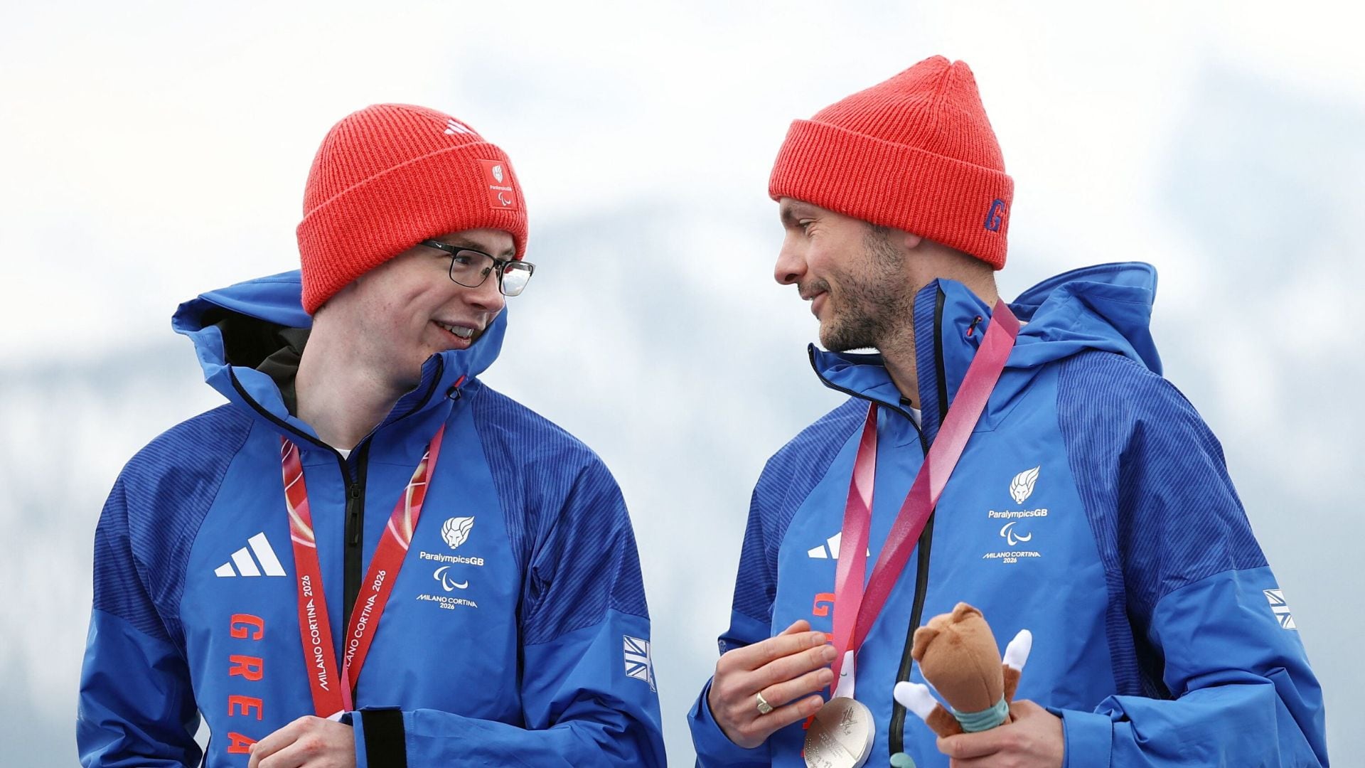 Juegos Paralímpicos Milán Cortina 2026 - Esquí Alpino Adaptado - Ceremonia de Premiación de la Combinada Alpina Masculina para Discapacitados Visuales - Centro de Esquí Alpino Tofane, Belluno, Italia - 10 de marzo de 2026. Los medallistas de plata Neil Simpson de Gran Bretaña y su guía Rob Poth de Gran Bretaña celebran en el podio tras la victoria en la combinada alpina masculina de eslalon para discapacitados visuales. REUTERS/Stoyan Nenov
