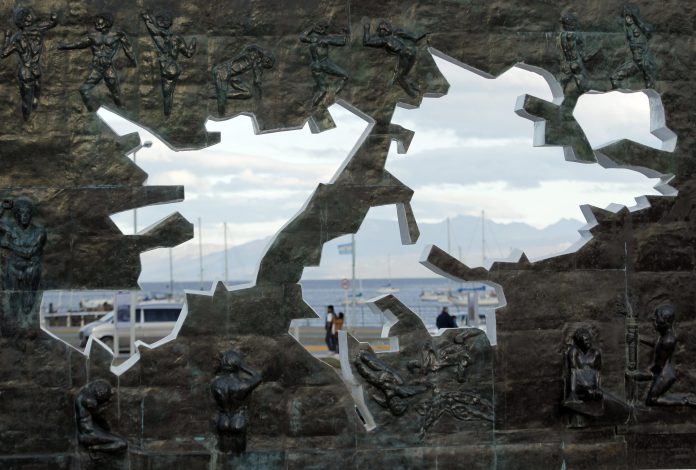 Fotografía de archivo en la que se registró un monumento con el mapa de las Islas Malvinas. EFE/Leo La Valle