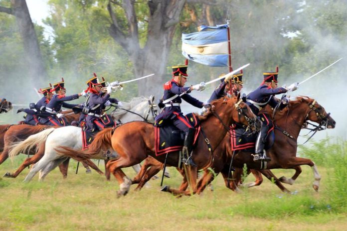Granaderos a Caballo argentinos realizan una carga ceremonial a caballo, con espadas desenvainadas y una bandera nacional, recreando un momento histórico (Imagen Ilustrativa Infobae) (Regimiento de Granaderos a Caballo)